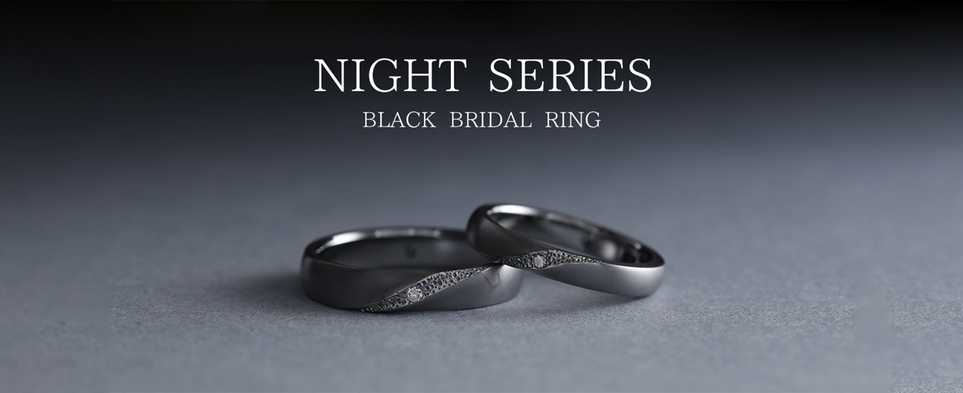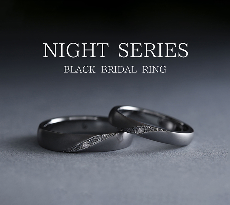 静寂の中で輝く星のように――。NIGHT SERIESは、シックで繊細な風合いの中にダイヤモンドやテクスチャーで“光の筋”を描き出します。指先に広がるブラックのリングに、穏やかにきらめく光が星空のように添えられ、ふたりの未来を静かに照らします。