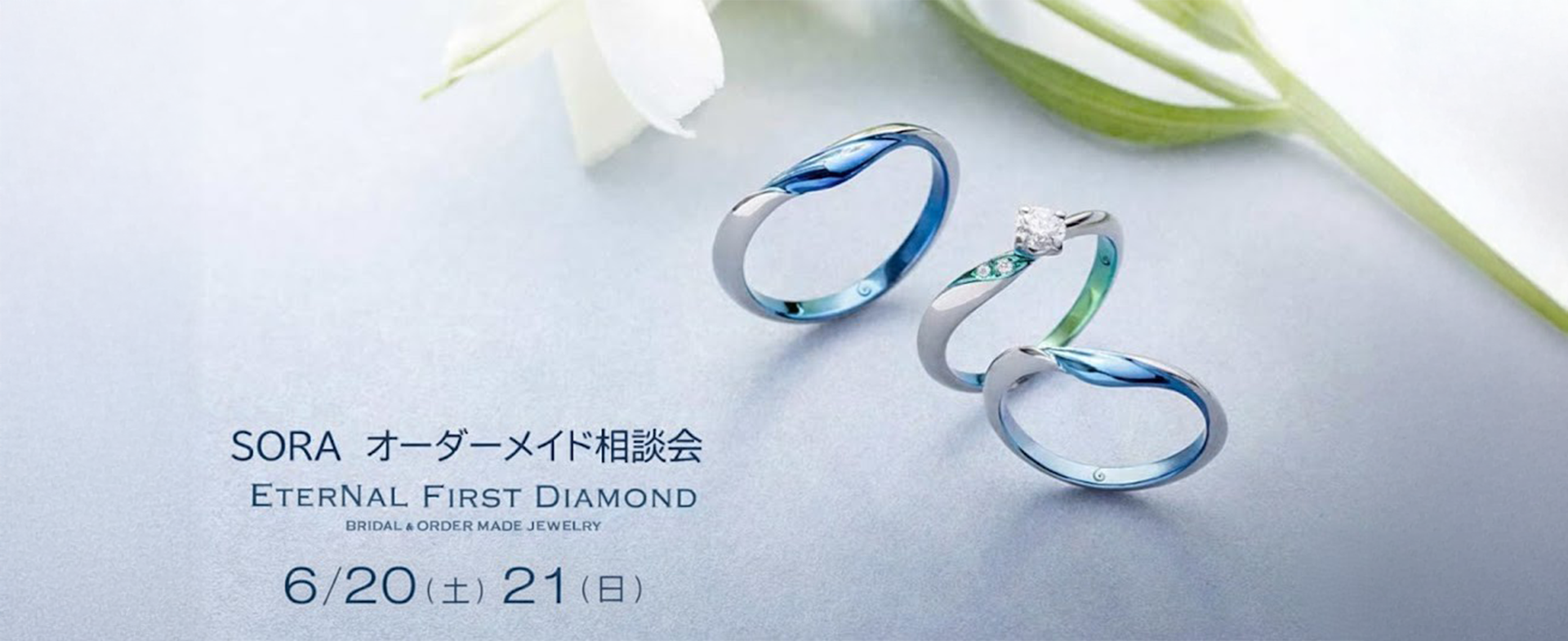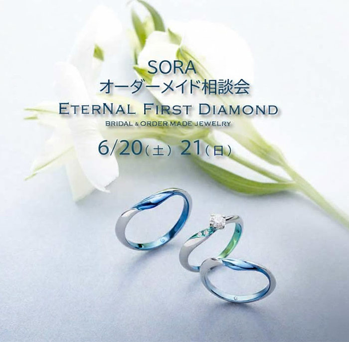 浜松市で2日間限定!婚約指輪・結婚指輪のブランド、カラーの選べるSORAのオーダーメイド相談会。表参道本店限定のデザイン、SORAオリジナル素材で製作するオンリーワンの婚約指輪や結婚指輪の相談会です。金属アレルギーでお悩みのお客様や自分らしいカラーを選びたいお客様もお気軽にご参加ください。